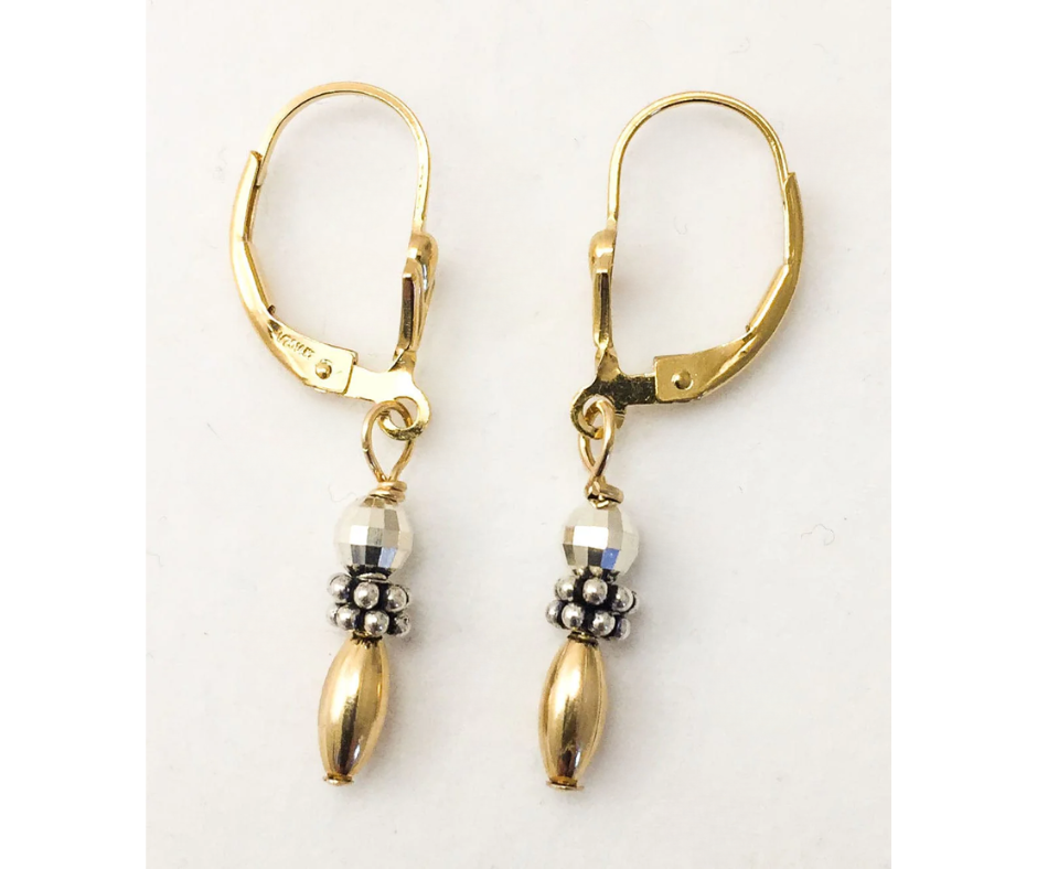 Everyday two tone 14 karat gold filled lever back. Smooth, gold oblong bead on the bottom with decorative silver and a shiny, faceted sterling silver ball on top. Measuring 1 3/8 inches in length. Enjoy!