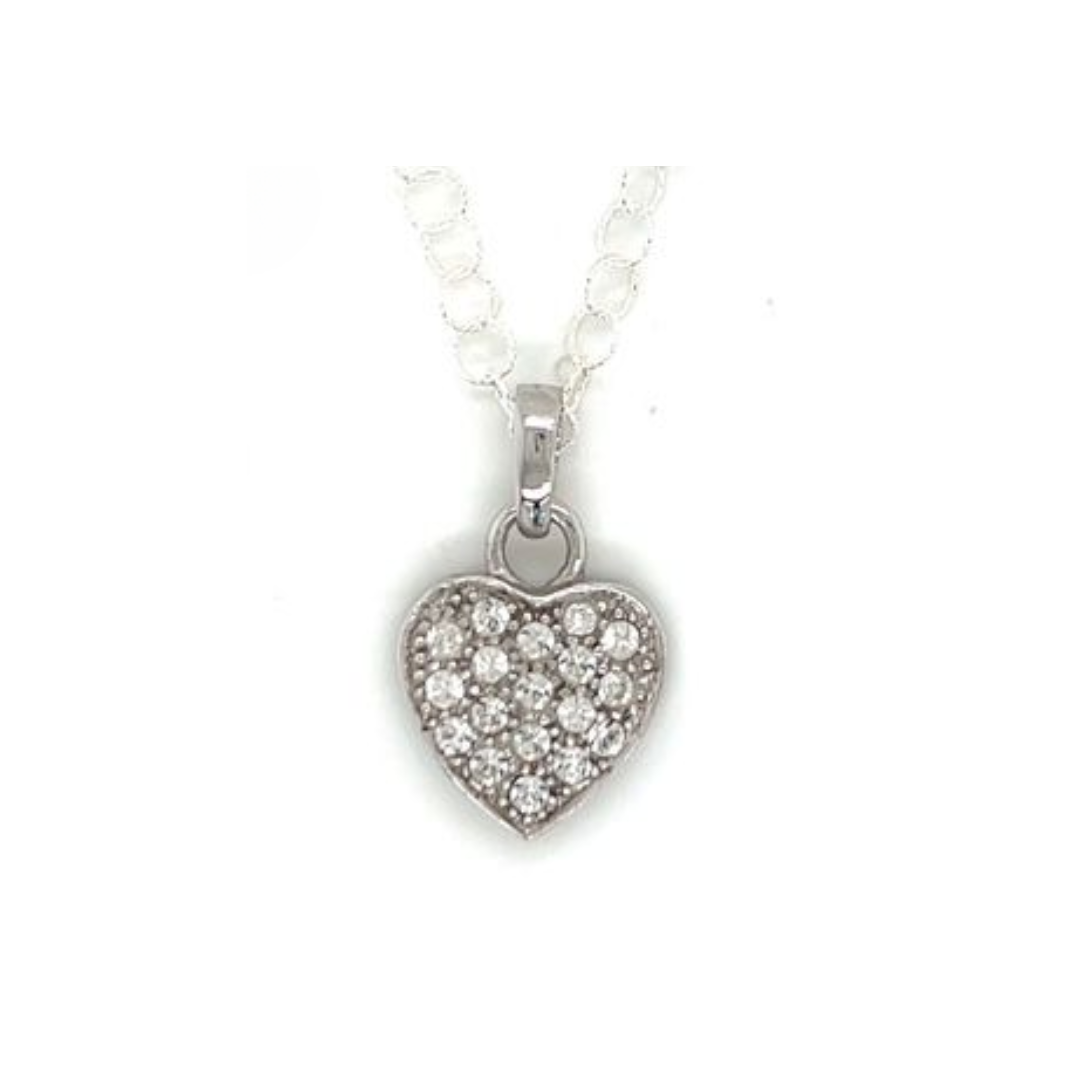 The heart-shaped pendant features pave-set cubic zirconia stones for brilliant shine, while the textured sterling silver chain adds subtle detail.