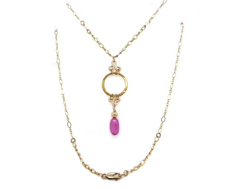 Simplicity meets elegance in this captivating design featuring a natural pink sapphire drop, a gemstone known for its soft, feminine glow.