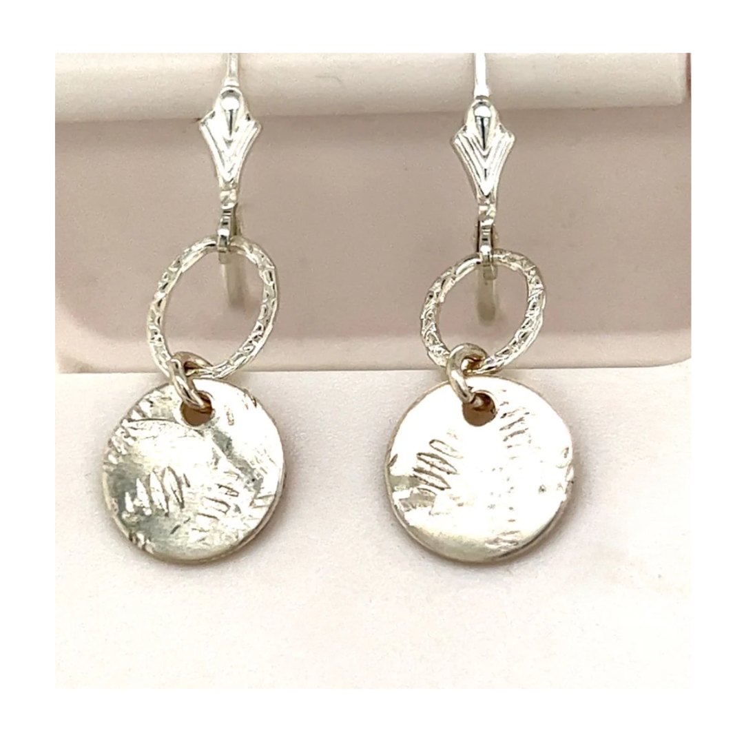 Sterling silver Fleur-de lis lever backs with a sterling oblong hoop drop and a hand textured circular accent.